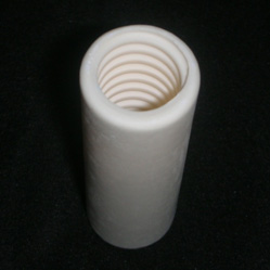 Internal threads are also easily accomplished at ATS using any of the dozens of different feedstock via injection molding. The most common way to thread an ID is using a removable core and turning the core out prior to removing the part from the mold. The image below is an alumina sleeve with the ID threaded.