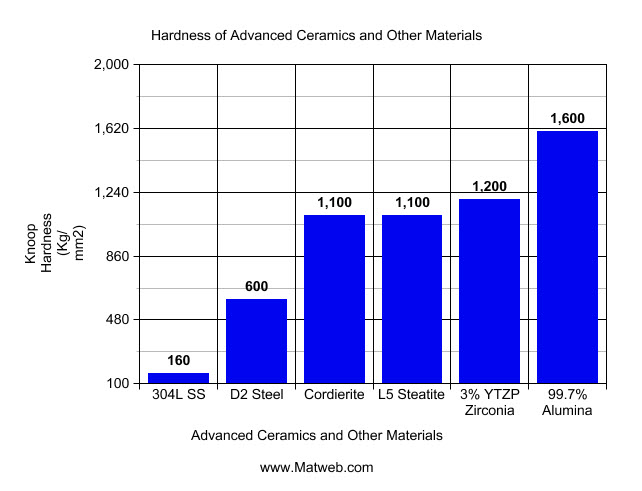 Hardness: the graph below illustrates the hardness of the same six materials. Once again the advanced ceramics alumina and zirconia are superior. Cordierite and Steatite are decent. The steels fall far short again.